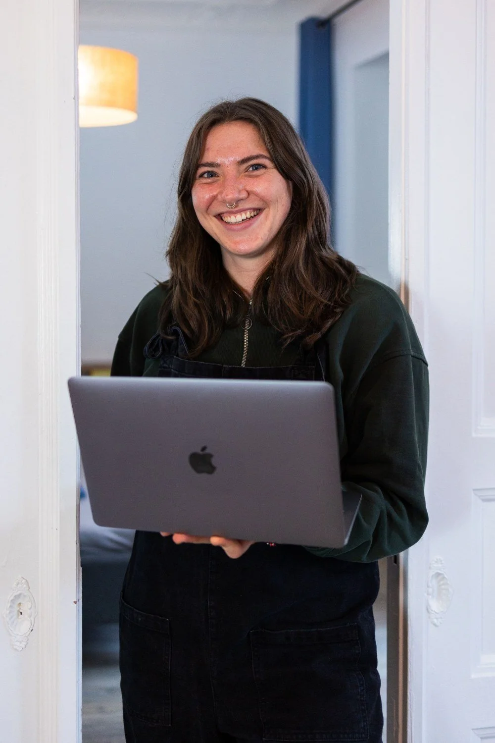 Designer Franzi mit Laptop vor offener Flügeltür
